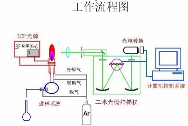 溶液進(jìn)入等離子體光源中受激發(fā),釋放出光子,形成該元素的特性譜線,譜線的強(qiáng)度和蒸汽中原子的濃度成正比,進(jìn)行定量測(cè)定。