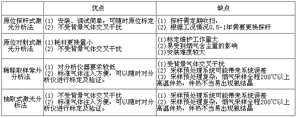 脫硝氨逃逸濃度的量級一般都是幾個ppm,對其準(zhǔn)確測量比較困難。目前國內(nèi)外用于煙氣脫硝系統(tǒng)氨逃逸在線監(jiān)測的方法主要有以下幾種,優(yōu)缺點(diǎn)如下: