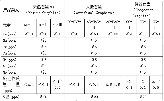 表1:不同類別的鋰離子電池石墨類負(fù)極材料的元素含量限定技術(shù)指標(biāo)