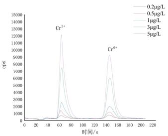 用1 mg/L Cr3+和Cr6+混合標(biāo)準(zhǔn)溶液依次稀釋配制濃度分別為0.2 μg/L、0.5 μg/L、1.0 μg/L、3 μg/L、5 μg/L Cr3+和Cr6+混合工作曲線標(biāo)準(zhǔn)使用液。